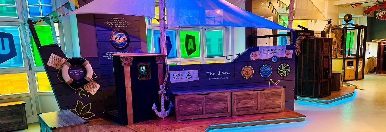 So nennt sich die neue Spielewelt im UNIKATUM Kinder- und Jugendmuseum Leipzig. Darin erwartet Kinder ab dem Kita-Alter eine bunte Erlebniswelt, in der freies Gestalten, Spielen und gemeinsames Erforschen im Mittelpunkt stehen. In den Erlebnisbereichen können junge Gäste dabei ihre Kreativität entdecken: An der Bastel-Bar wird gemalt, gewerkelt und gestempelt; eine große Murmelbahn kann immer wieder neu weitergebaut werden. Außerdem regen ein Gedankenschiff mit Schatzkisten, das Dschungelklavier sowie ein "Quatsch-Laden" die eigene Fantasie und Neugier an.